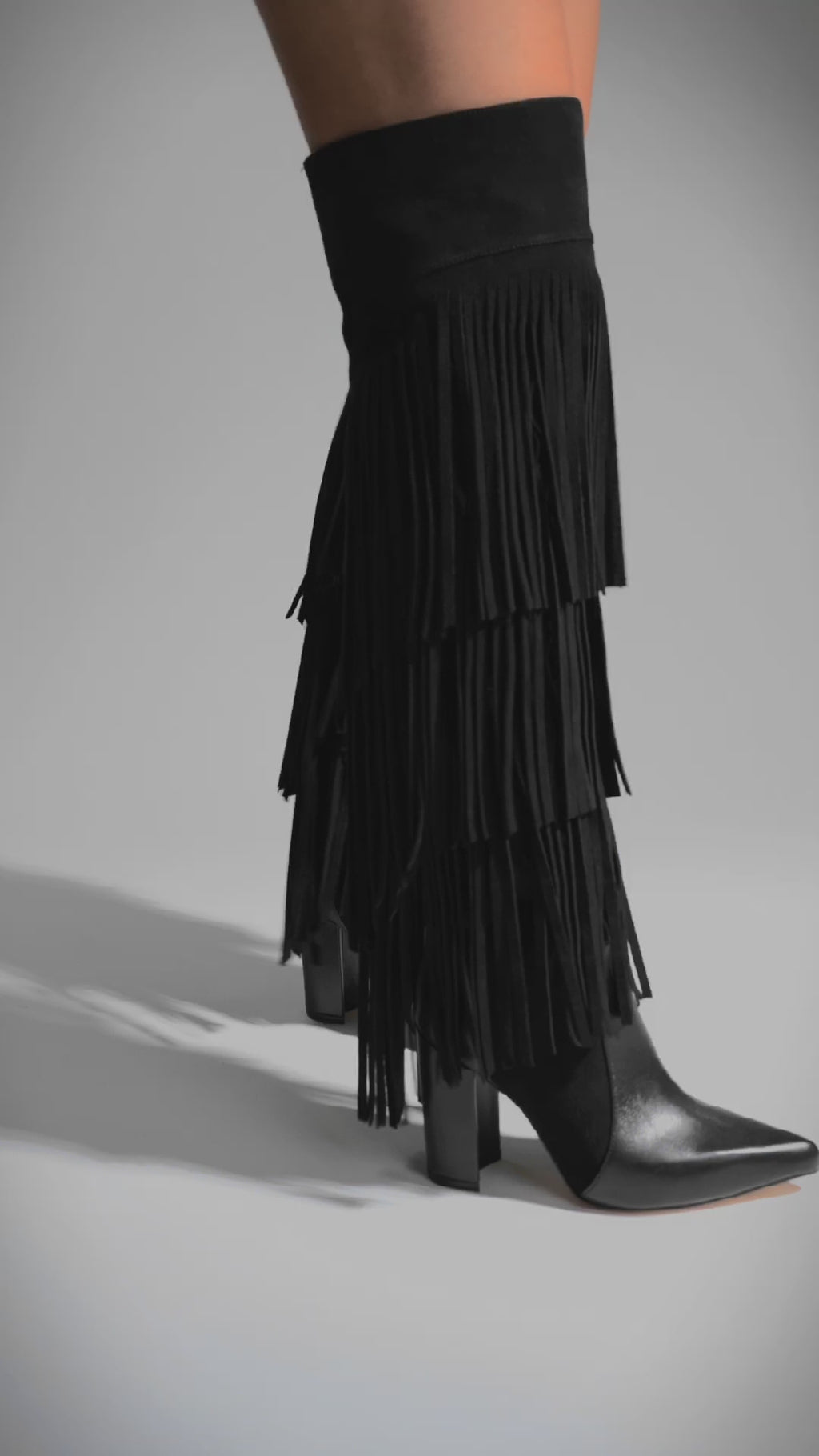 Mid-calf boot crafted from black suede. The fringes covering the boot lend dynamism, determination, and sensuality to every step you take. The 9.5cm heel will elevate your elegance.